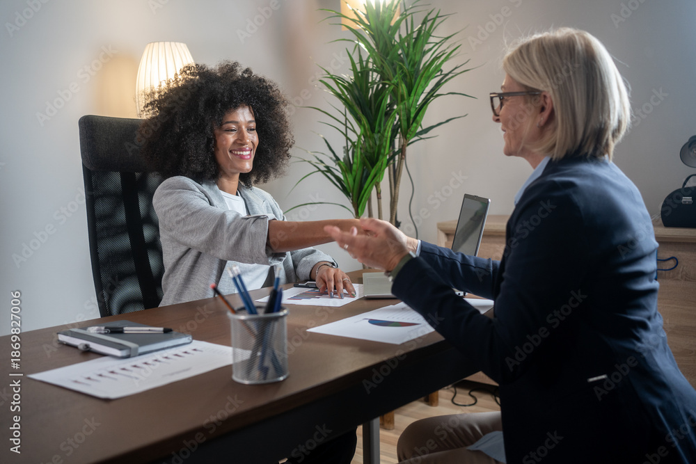 Happy bank manager shaking hands with a client after successful agreement in the office.