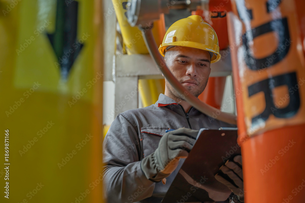 Asian engineer wearing glasses working in the boiler room,maintenance checking technical data of heating system equipment,Thailand people