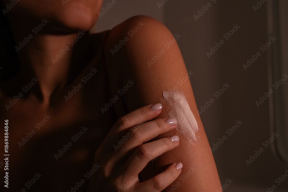 Young woman touching shoulder skin with hands while applying body cream. Skincare routine, moisturising texture, beauty care and self care concept