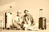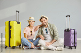 Portrait of happy smiling young couple sitting with suitcases on gray studio background and looking cheerful at camera ready for holiday trip. Vacation, travelling and summer journey concept.