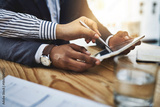 Hands, team and business people with tablet for planning, budget review or audit in office. Technology, pen and accountant in meeting for financial report, revenue discussion or bookkeeping feedback