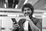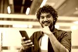 Close-up portrait of a young Indian man sitting in a chair at a desk in an office, holding a phone and smiling at the camera