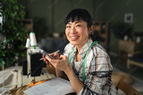 Asian woman working on sewing project using machine