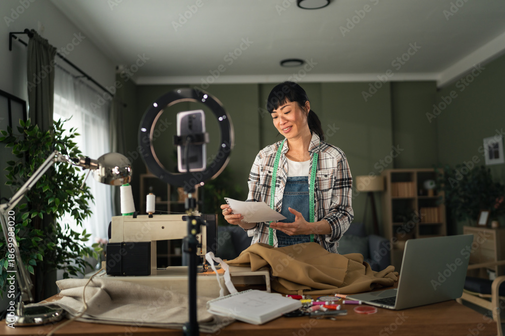 Woman creating online sewing tutorial video at home