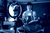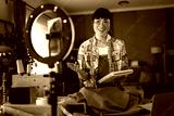 Woman creating online sewing tutorial video at home