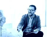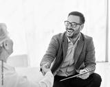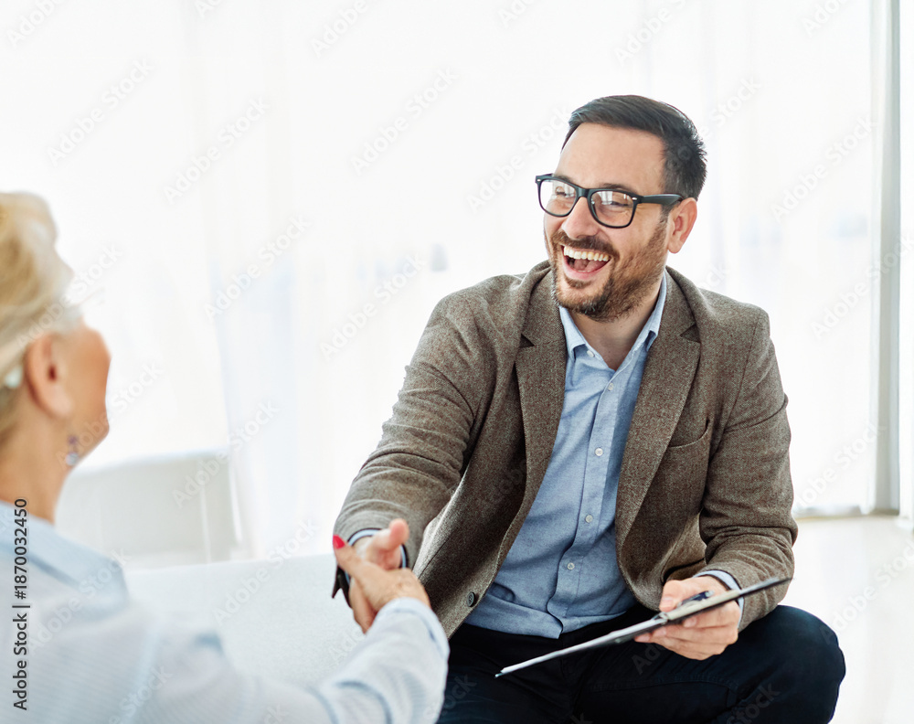 Portrait of a businessman or real estate agent or doctor shaking hands and signing a deal contract with senior woman or businesswoman in his office