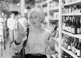 Mature woman chooses Italian wine in the alcohol department of a hypermarket. Adult woman with gray hair choosing semi-sweet wine for dinner