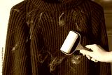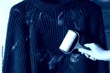 Woman cleaning sweater with lint roller near light grey wall indoors, closeup