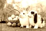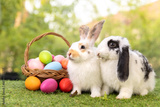 Lovely bunny easter fluffy baby rabbit eating green grass with a basket full of colorful easter eggs on green garden nature background on warmimg day. Symbol of easter day festival.