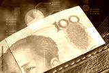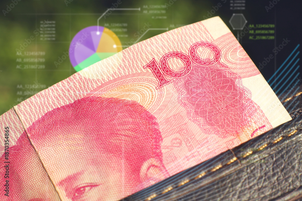 Close-up of a 100 Yuan banknote with a holographic financial data overlay, representing China's economy, currency trading, and market analytics.
