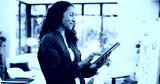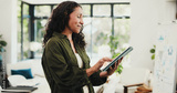 Tablet, smile and research with business woman in office for planning, editor feedback and article review. Online journalist report, story fact check and digital blog with mature person at agency