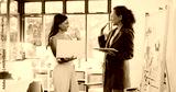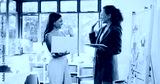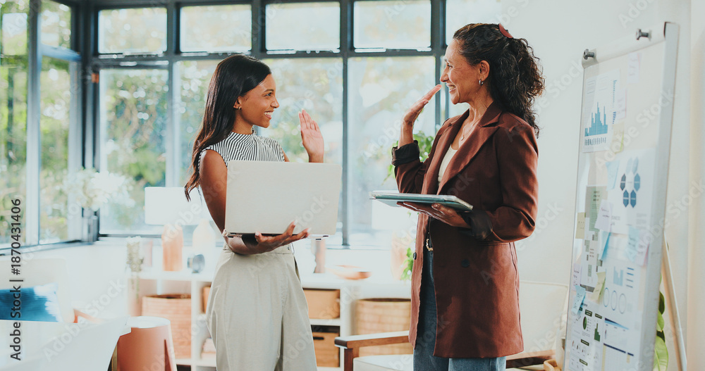 Creative women, high five and tech for designer agency in office for internship or project management. App, meeting and celebration with woman, mentor and coaching for training conversation or update