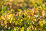 Sunlit soy fields, Agronomist observes lush soybean crops during golden evening glow, Field of young soybeans illuminated by setting sun with dewdrops and rich foliage