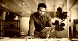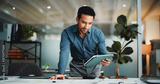 Finance, review or man in office with tablet, funding ideas or data analysis for budget pitch. Research, paper and analyst in workplace with tech, online report or proposal update for investment plan