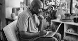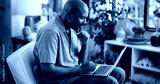 Remote work, reading or black man in home with laptop, lead update or edit of article. Freelancer, mature person or journalist in living room with technology, fact check or source contact on email.