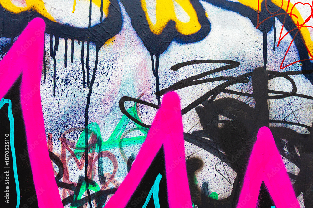 Abstract urban graffiti - neon pink, yellow, black on textured wall. 90s street style, fluorescent colors, dripping effect, layered tags. Background, texture, creative banner, modern 2000s, y2k visual