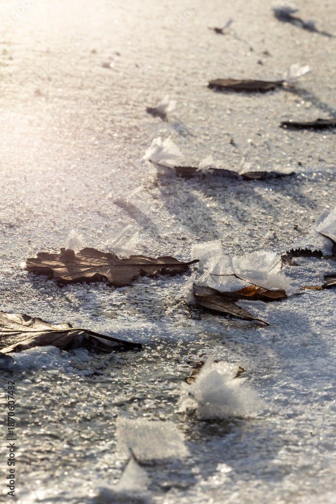 A detailed macro photograph of delicate snow crystals,
