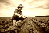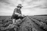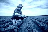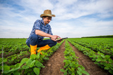 Agricultural worker is cultivating soybean. He is using digital tablet and examining plants.