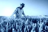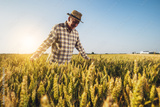 Senior man is walking through his growing wheat field. Farmer is satisfied with growth of crops.