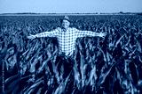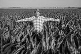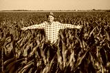 Cheerful senior farmer is standing in his growing corn field with arms outstretched.