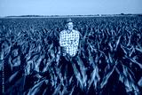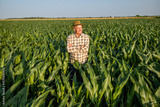 Satisfied senior farmer is standing in his growing corn field. He is looking away and smiling.