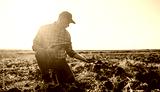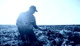 An experienced farmer with a clipboard checks the soil quality before sowing. An agronomist in a checkered shirt works in a field, holding a sample of black soil. Concept of gardening and ecology.