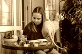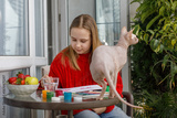 Attractive child girl painting and sitting with cat pet on the terrace. Kid 11 years old, leisure activity at home