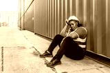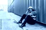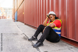 Exhausted female African construction worker in hard hat and safety vest sitting against a red container, looking stressed and tired while holding a phone during a break at a logistics site.