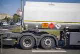 A truck transports liquid cargo on a busy street with various traffic signs and nearby vehicles in the background during a clear day