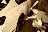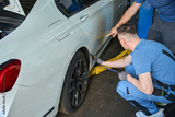 Adult mechanic inspects a car wheel on a lift