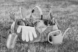 Gardening tools in basket and watering can on grass