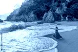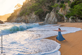 Yoga poses at Cala Boadella Beach, Catalonia, Costa Brava, Spain at sunset