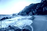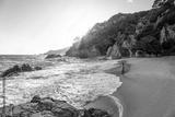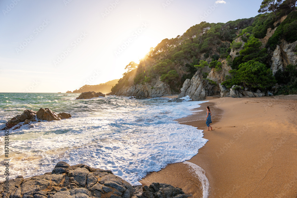 Yoga poses at Cala Boadella Beach, Catalonia, Costa Brava, Spain at sunset