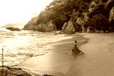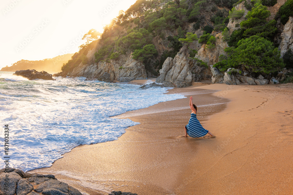 Yoga poses at Cala Boadella Beach, Catalonia, Costa Brava, Spain at sunset