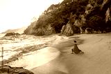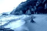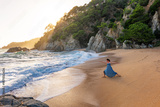 Yoga poses at Cala Boadella Beach, Catalonia, Costa Brava, Spain at sunset