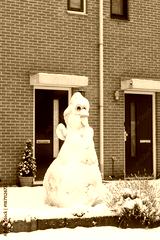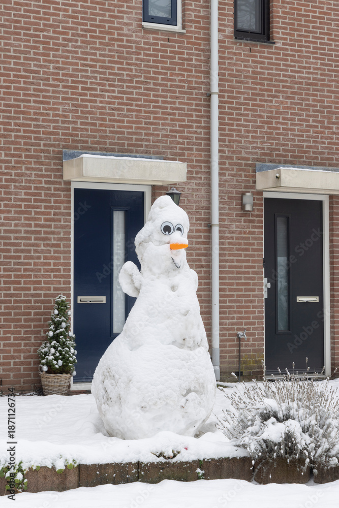 Winter scene in the Netherlands: snowman in front of brick house with blue door