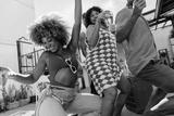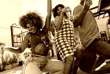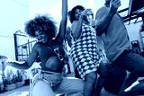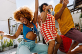 Two women and a man dancing at a lively outdoor funk music party
