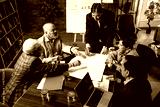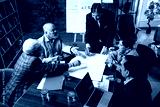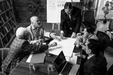 Senior Indian Asian executives reviewing plans and drawings together at modern office desk