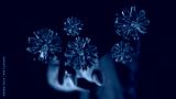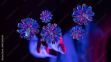 Artistic render of crystals floating near a hand in neon light. Conceptual image of technology and innovation,