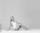 Young, beautiful and sporty woman in slimming underwear. Woman in white lingerie over grey background.