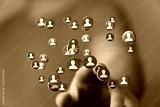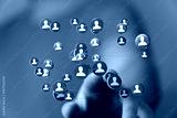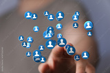Hand touching network of icons, representing the concept of connections, social network, business network, and communication in blue color