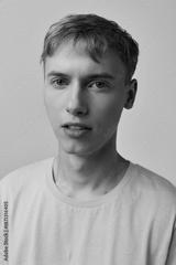 Young man in a yellow shirt against a vivid yellow backdrop, close up head and shoulders, soft studio lighting, calm expression, contemporary lifestyle image for fashion and branding use