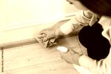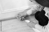 Woman with cleaning product wiping dust from baseboard indoors, above view. Space for text