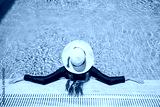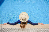 Woman in straw hat relaxes by pool, leaning her hands on side. Girl relaxes in resort pool, enjoying summer vacation. Resort vacation concept, hotel