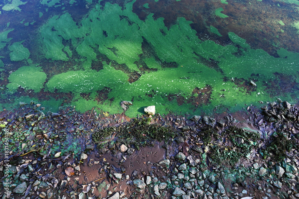 Shallow water shoreline covered with green algae and aquatic plants, creating a natural textured background. Environmental concept of freshwater ecosystem, water pollution and ecological balance.