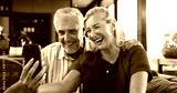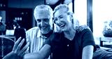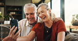 Video call, mature or couple in house with phone, connection or online conversation in living room. Happy, senior man or woman in home with tech, digital communication or bonding with virtual app.