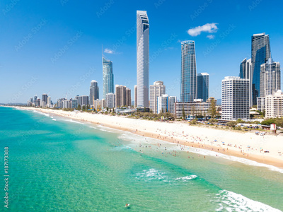 Surfers Paradise aerial view on a clear day on the Gold Coast with blue water