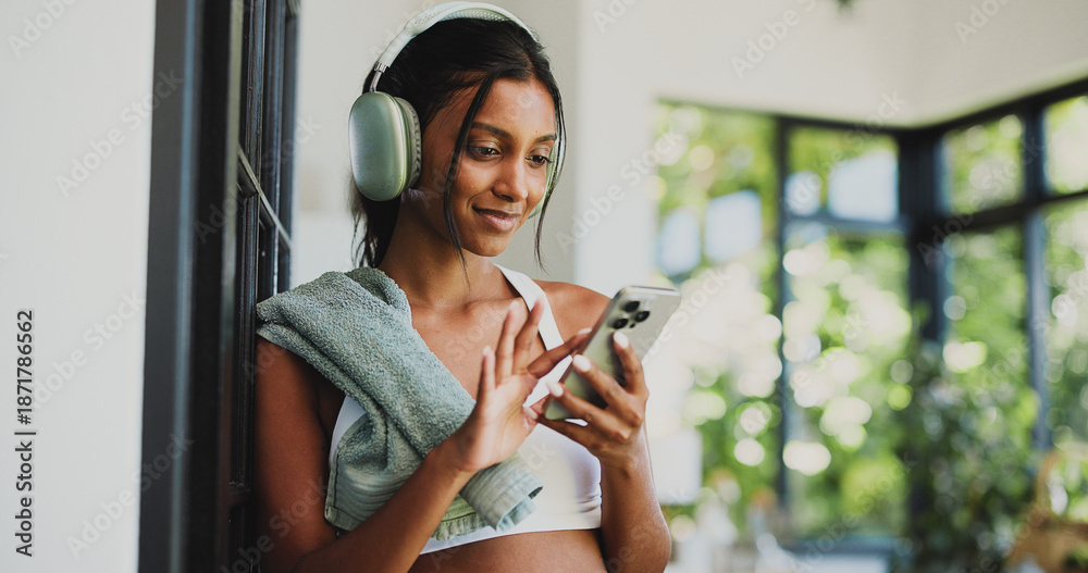 Fitness, smartphone and woman with headphones, texting or smile with tech, wellness and social media. Happy, athlete and Indian person with mobile for chat, space and subscription for music in house