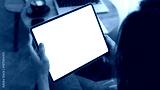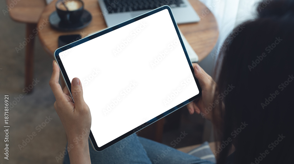 Mockup image of woman using digital tablet with blank white screen during working with laptop computer at coffee shop, close up. Mockup tablet for online marketing or web template