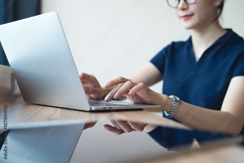 Young asian business woman online working on laptop with digital tablet on table, surfing the internet, online work, closeup. Woman freelancer typing on laptop computer on office table at home.